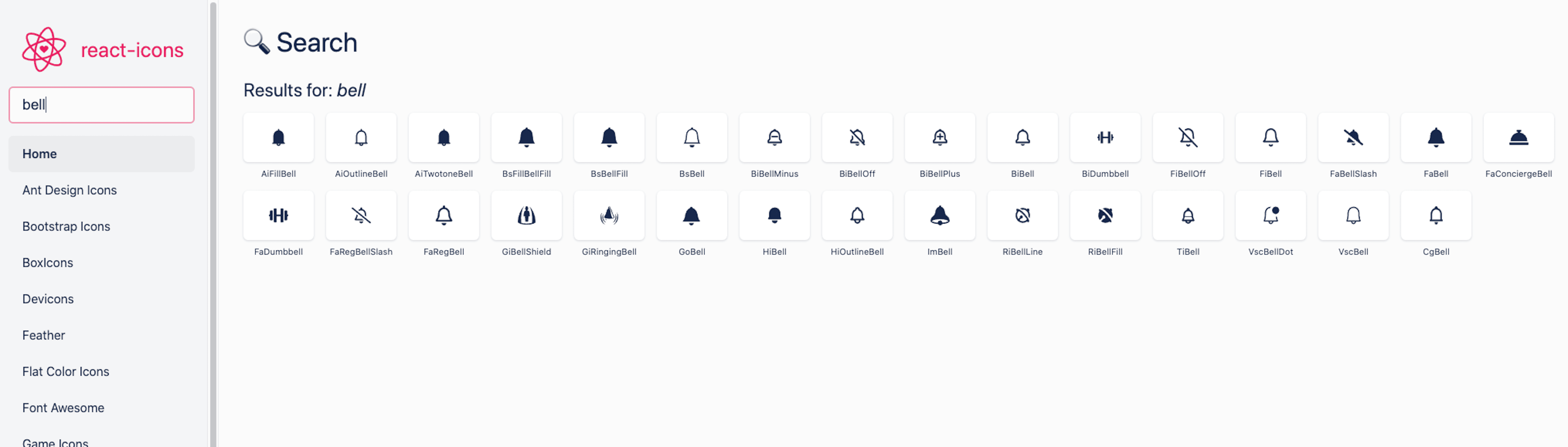 Head on over to the react-icons website to browse the icon collections. I would recommend searching for the icon you need, for example, “bell”.