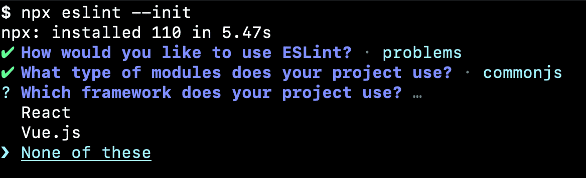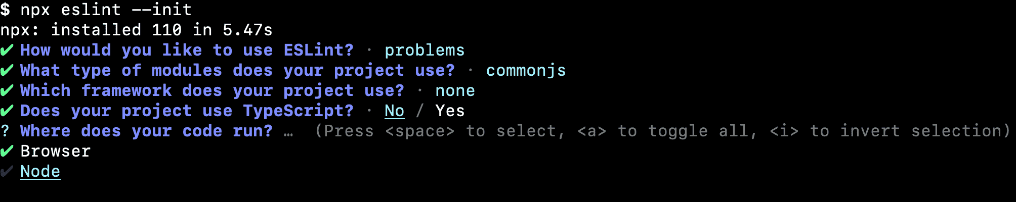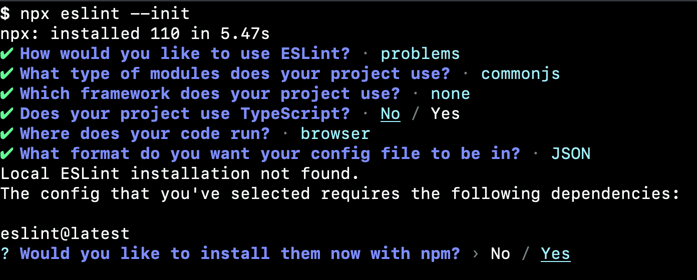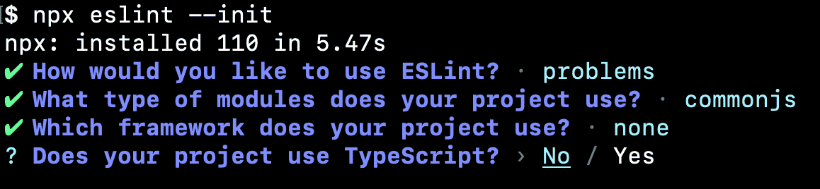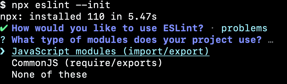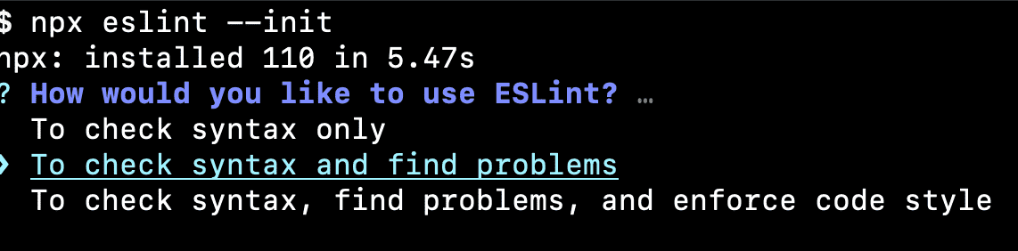 npx eslint --initNote: if npx does not work, you can try installing eslint globalling with “npm i -g eslint” or upgrading node to a version past v5.2.0.