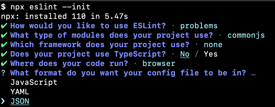 Choose what kind of file type your eslint config will be. JSON is the most popular but having a config file in JavaScript allows you to add comments.